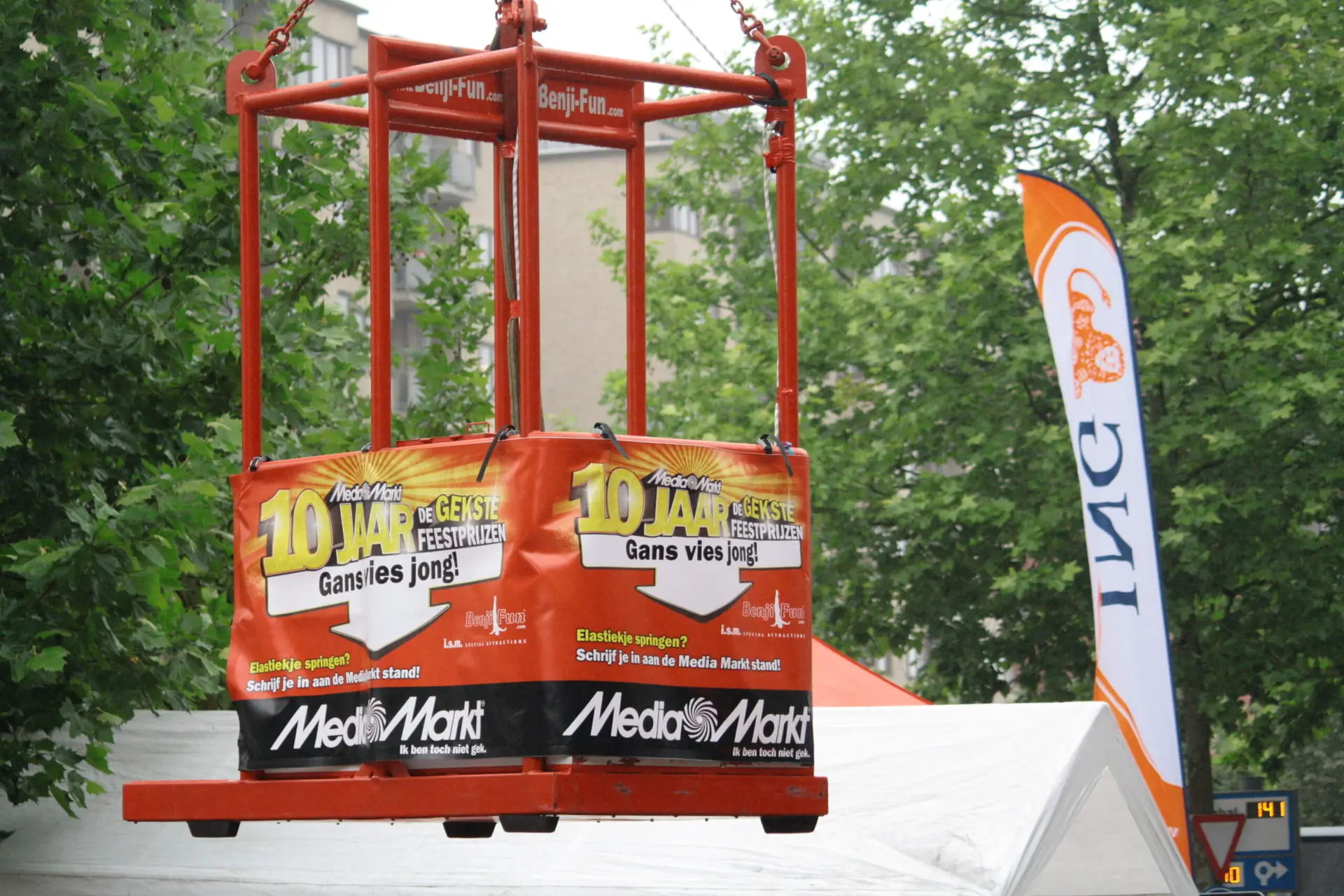 Bij Benji-Fun werken we meestal van een standaard mobiele hijskraan van 60m hoogte. Beveiligd aan een harnas, beenbinders en elastiek, spring je onder professionele begeleiding naar beneden.