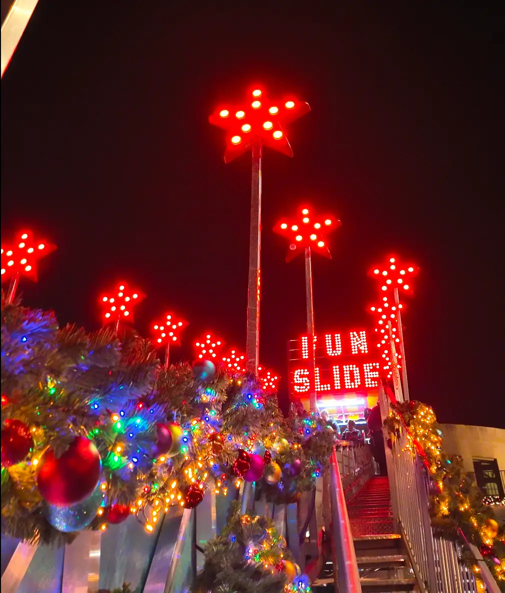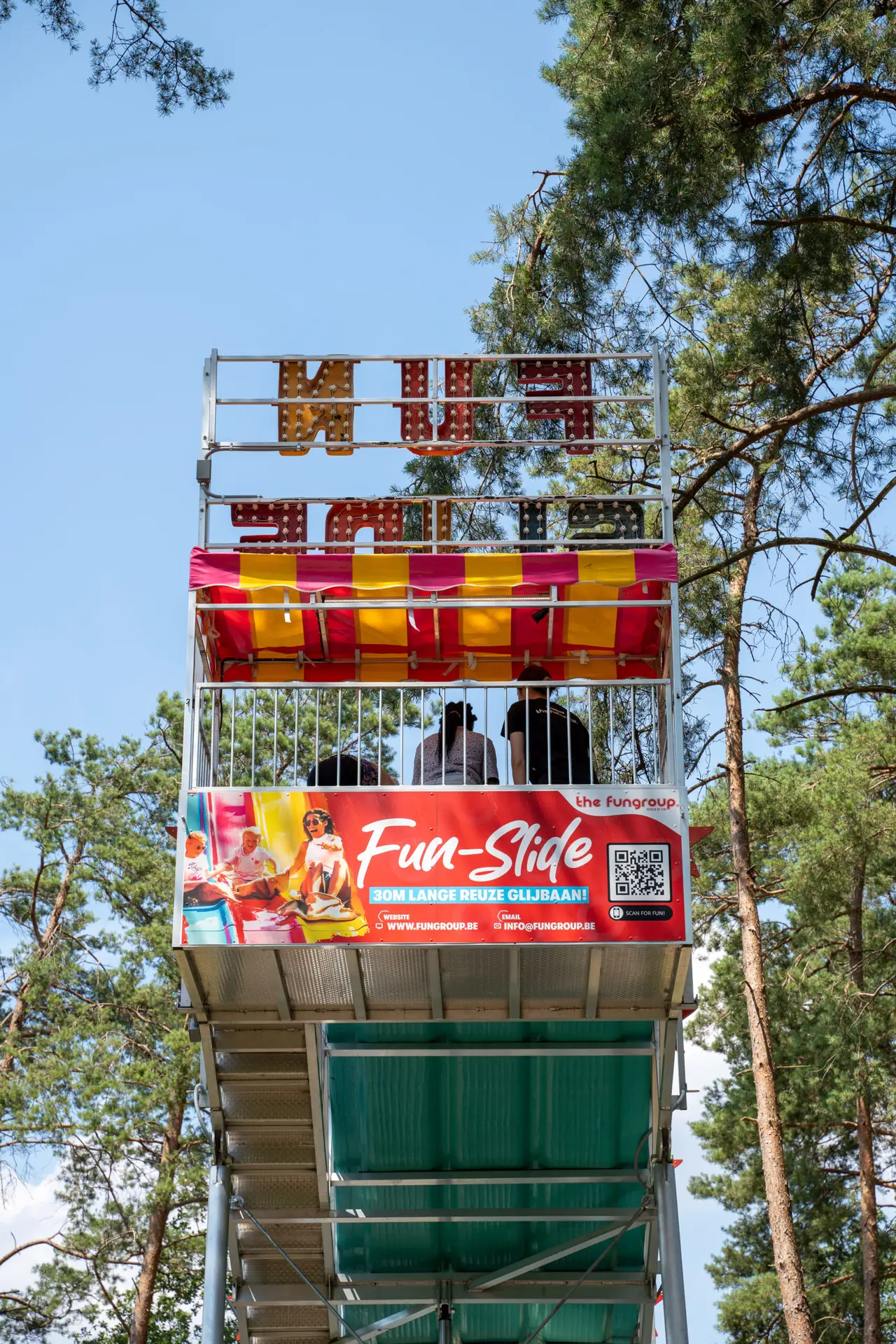 Ontdek de Fun-Slide: 9 m hoog en 30 m lang, geschikt voor alle leeftijden! Drie personen kunnen tegelijk naar beneden racen voor een gegarandeerd spektakel.