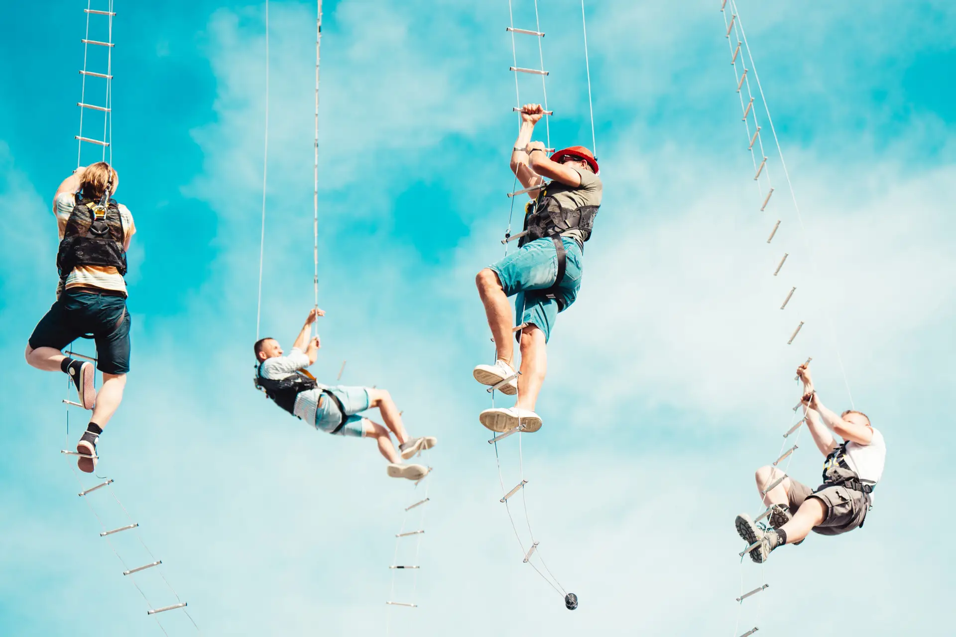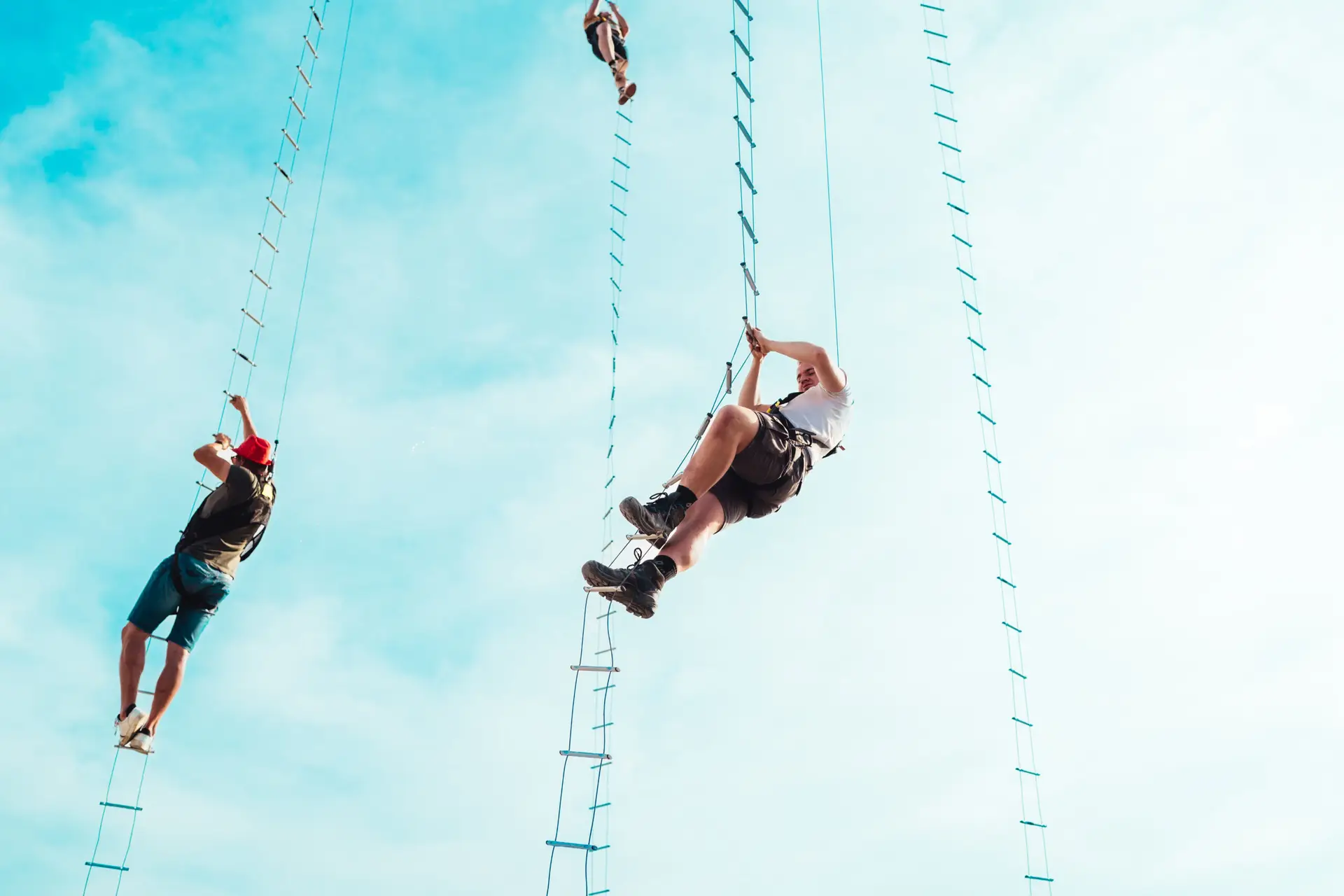 Veiligheid staat bij Sky-Climbing voorop. Elk deelnemer draagt een professioneel veiligheidsharnas, zodat je vol vertrouwen kunt klimmen en de top veilig kunt bereiken, ongeacht je ervaring of leeftijd. Het systeem is ontworpen om maximale veiligheid te combineren met maximale beleving.