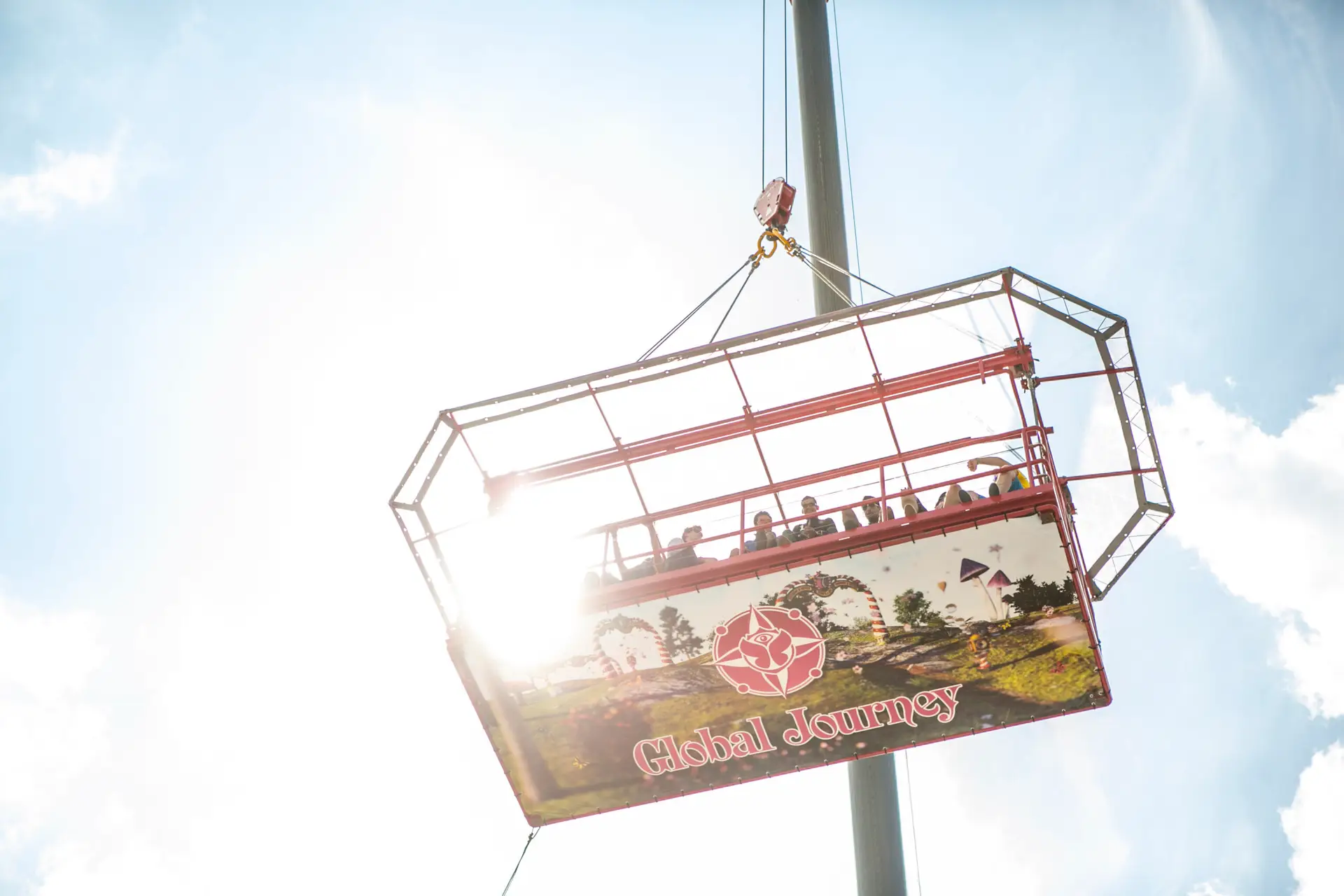 Bezoekers stappen op het platform en worden rustig omhoog gebracht. Eenmaal op hoogte kan men genieten van het uitzicht en de omgeving. De beweging is gecontroleerd en comfortabel, wat zorgt voor een ontspannen maar indrukwekkende ervaring.