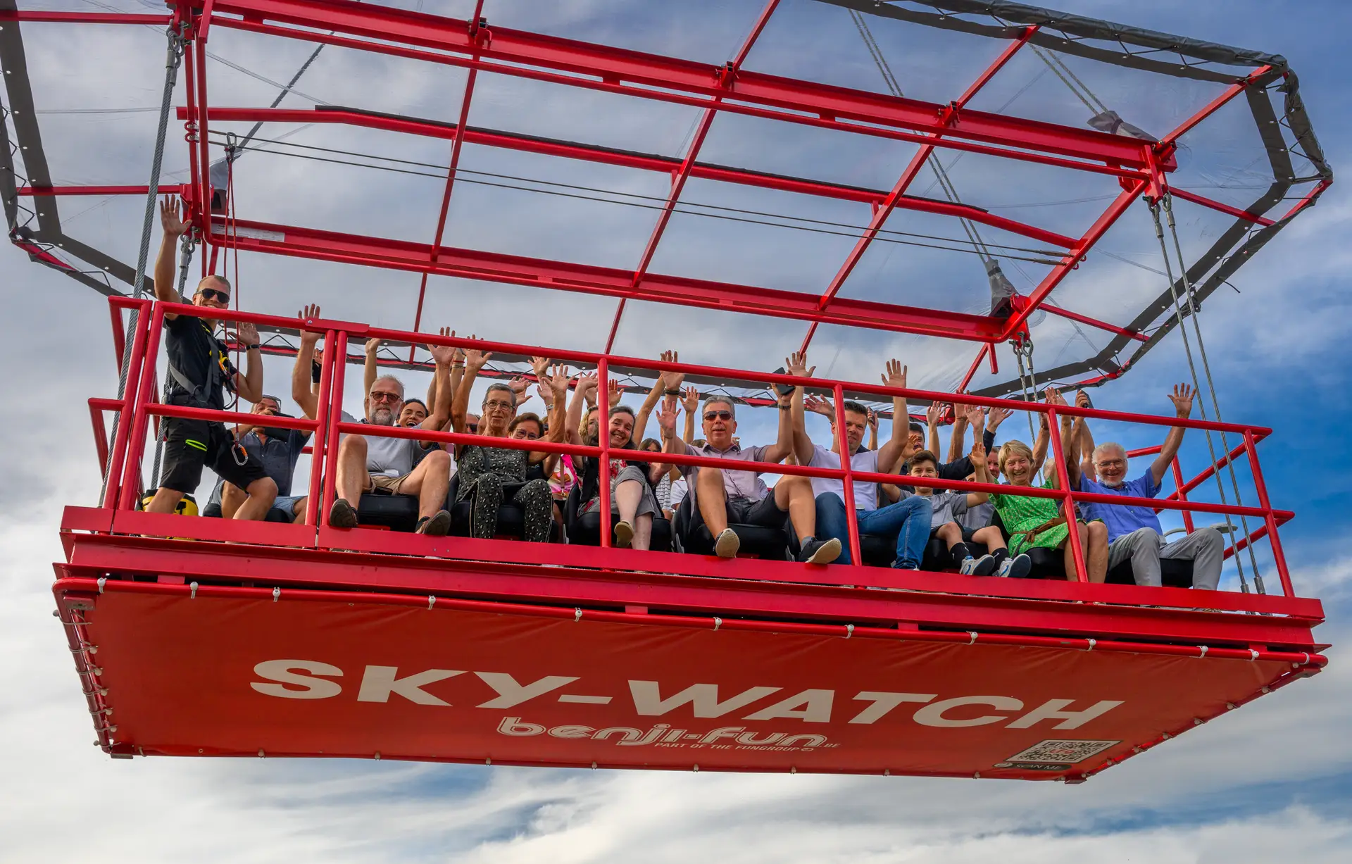 De Sky-Watch is een uniek platform waarbij we 24 personen naar een hoogte van 50 meter (of meer) hijsen. Onder professioneel toezicht laten we de gasten genieten van een 360° view over de regio. Deze attractie, met een zeer hoge capaciteit van 240 personen per uur, kan perfect gepersonaliseerd worden.